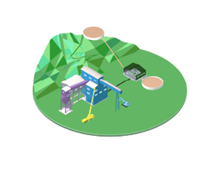 Storage tanks (can be buried) are located at the top and bottom of a small hill. The storage tanks are connected by penstocks (underground pipes).